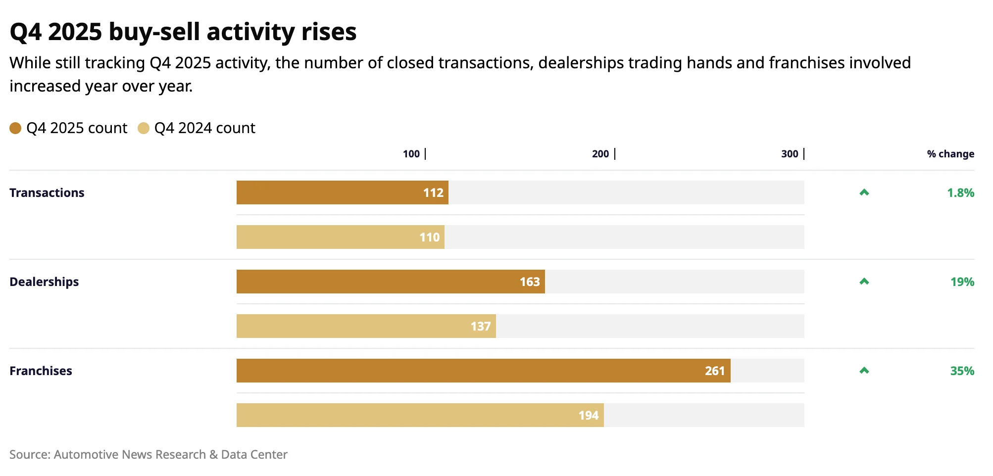 The Automotive News Buy-Sell Database counted 112 fourth-quarter transactions, up slightly from 110 in 2024. In the fourth quarter, Automotive News found 163 dealerships and 261 franchises were involved in the transactions, up from 137 dealerships and 194 franchises in the 2024 fourth quarter.