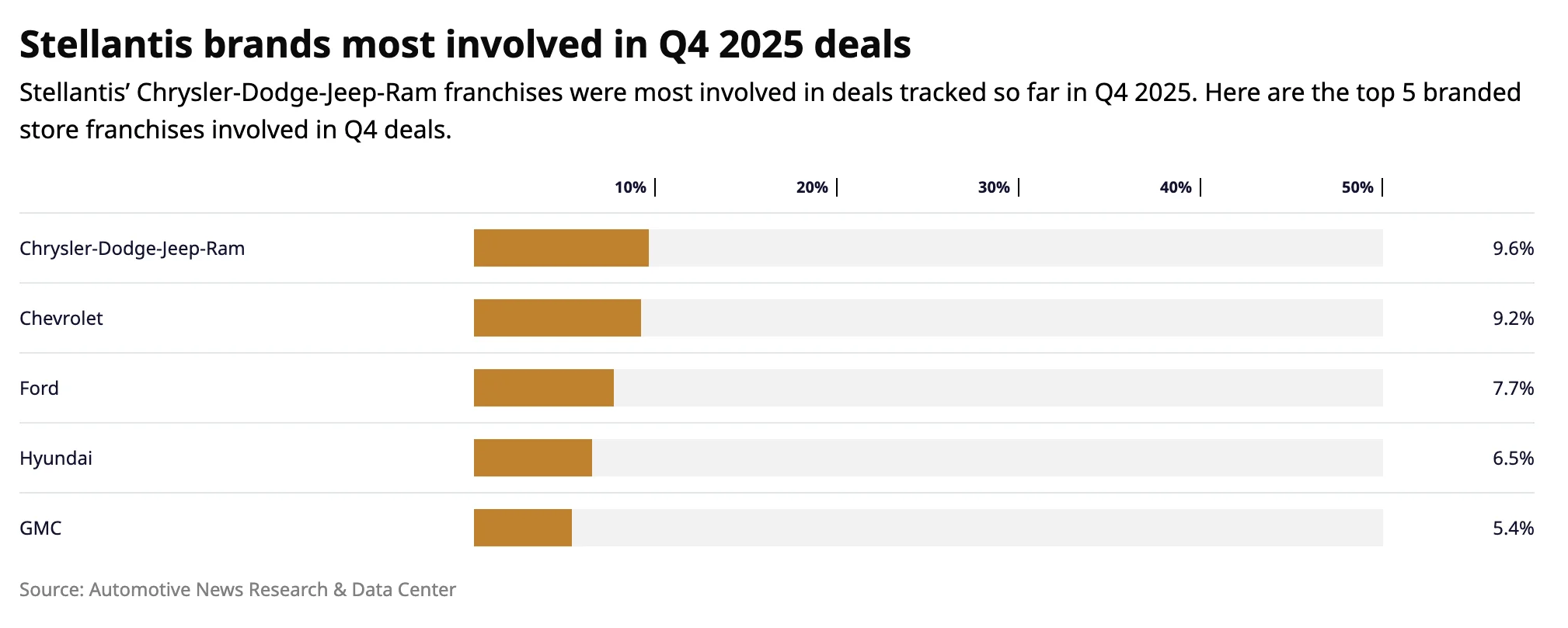 Chrysler, Dodge, Jeep and Ram dealerships were bought and sold the most in the quarter. Automotive News found 25 stores selling these brands traded owners, more than double the number bought and sold in 2024 fourth quarter.