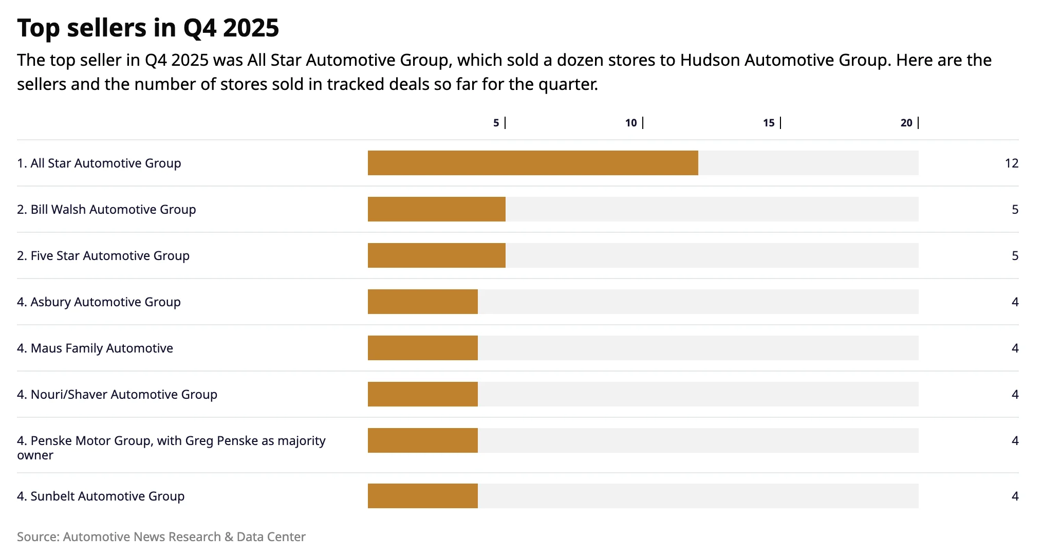 Tied as the second-biggest sellers in the quarter were Bill Walsh Jr., owner of Bill Walsh Automotive Group, and Five Star Automotive Group. Walsh on Dec. 15 sold all five of his Ottawa, Ill., stores to Home Run Auto. And Five Star Automotive that same month sold five suburban Atlanta stores to ALM Automotive Group.